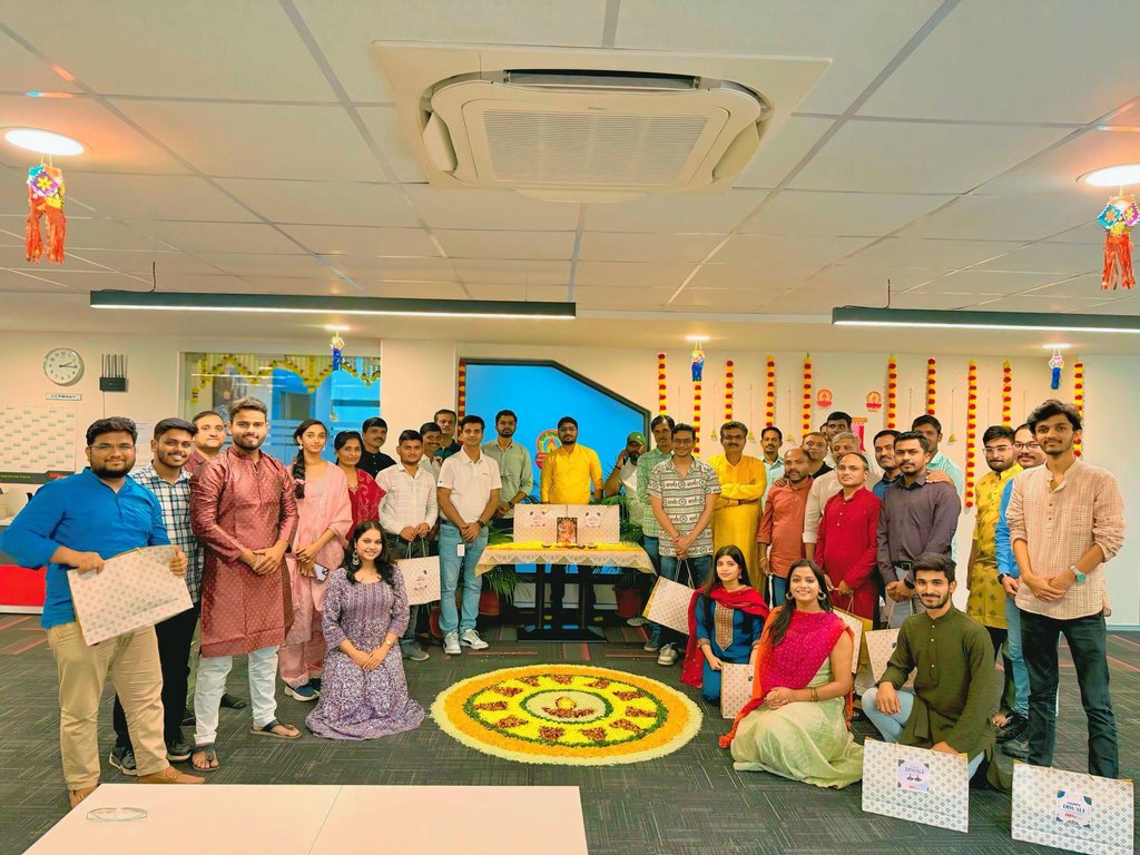 Unser Büro verwandelte sich in eine leuchtende Bühne der Tradition, als das Team in farbenprächtiger, festlicher Kleidung erschien – jeder Winkel erstrahlte in einem Meer aus Sarees, Kurtas und Sherwanis. Den Auftakt bildete eine kreative Diya-Malaktion, bei der mit viel Lachen und Fantasie kleine Kunstwerke entstanden – jedes Diya als Symbol für Licht, Hoffnung und festliche Stimmung.